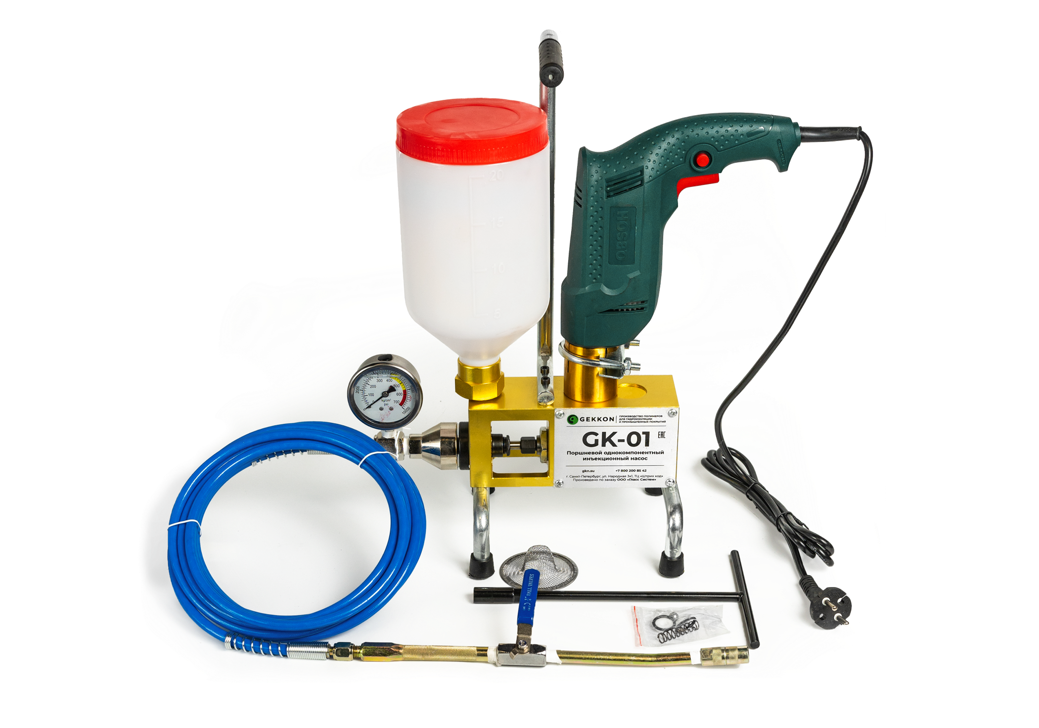 Инъекционный однокомпонентный насос GK-01 предназначен для подачи под давлением полиуретановых и эпоксидных смол. Модель широко используют при восстановлении целостности бетонных конструкций, заполнении пустот, герметизации и гидроизоляции деформационных швов, ремонта сухих и влажных трещин, предотвращения активных протечек. Внимание! Нельзя использовать с материалами на водной основе.